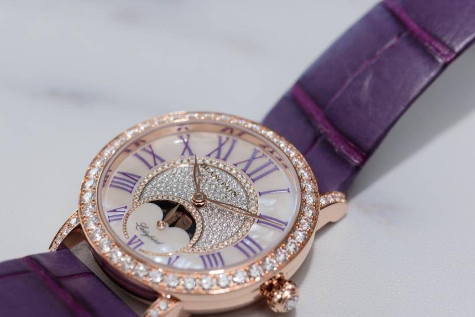 特别的珠光母贝外盘,正在光芒下折射出虹彩柔光,与微妙的紫色相得益彰,尽显文雅气韵。外盘采用的珠光母贝,需从特定的养殖贝壳里谨慎提取,每只贝壳仅能打制出一到两枚外盘。这种取自贝壳内部珍珠层最厚、最优质核心区域的材质,正在贝壳可用面积中占比亏损2%,其珍稀水准显而易见。别的,12枚以倾角计划的皇家紫罗马数字时标,文雅地透露于珍珠母贝外盘之上;下方由70颗钻石镶嵌而成的两枚掩饰圆环交迭相拥;符号性的镂空柳叶形指针轻疾地指示时光——这些谨慎计划的细节,联合修建了一幅协调而宽裕方针感的视觉画卷。